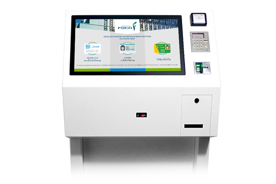un lecteur code-barre/QR Code, un lecteur/encodeur NFC et une imprimante thermique.