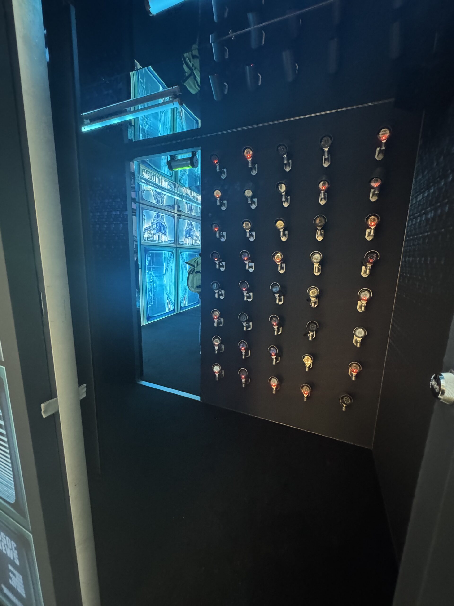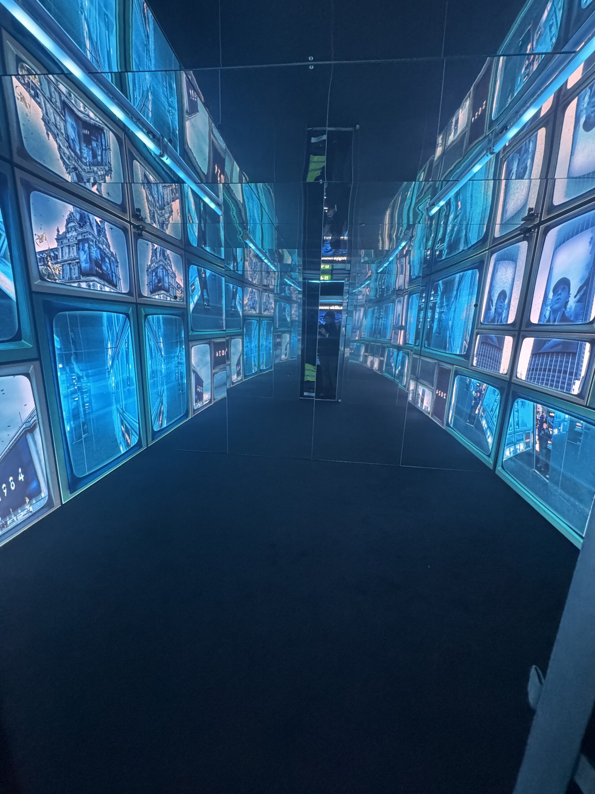 Les visages détectés étaient ensuite réinjectés quelques secondes plus tard dans une seconde salle immersive, habillée de murs d’écrans au rendu rétro inspiré d’anciens téléviseurs. Dans cet espace, les participants découvraient leur propre image diffusée à grande échelle dans l’environnement visuel, démultipliée sur les écrans pour renforcer la sensation de surveillance omniprésente et faire écho au célèbre imaginaire de “Big Brother is watching you”. Cette synchronisation entre captation, traitement et diffusion en temps réel constituait le cœur de l’expérience.