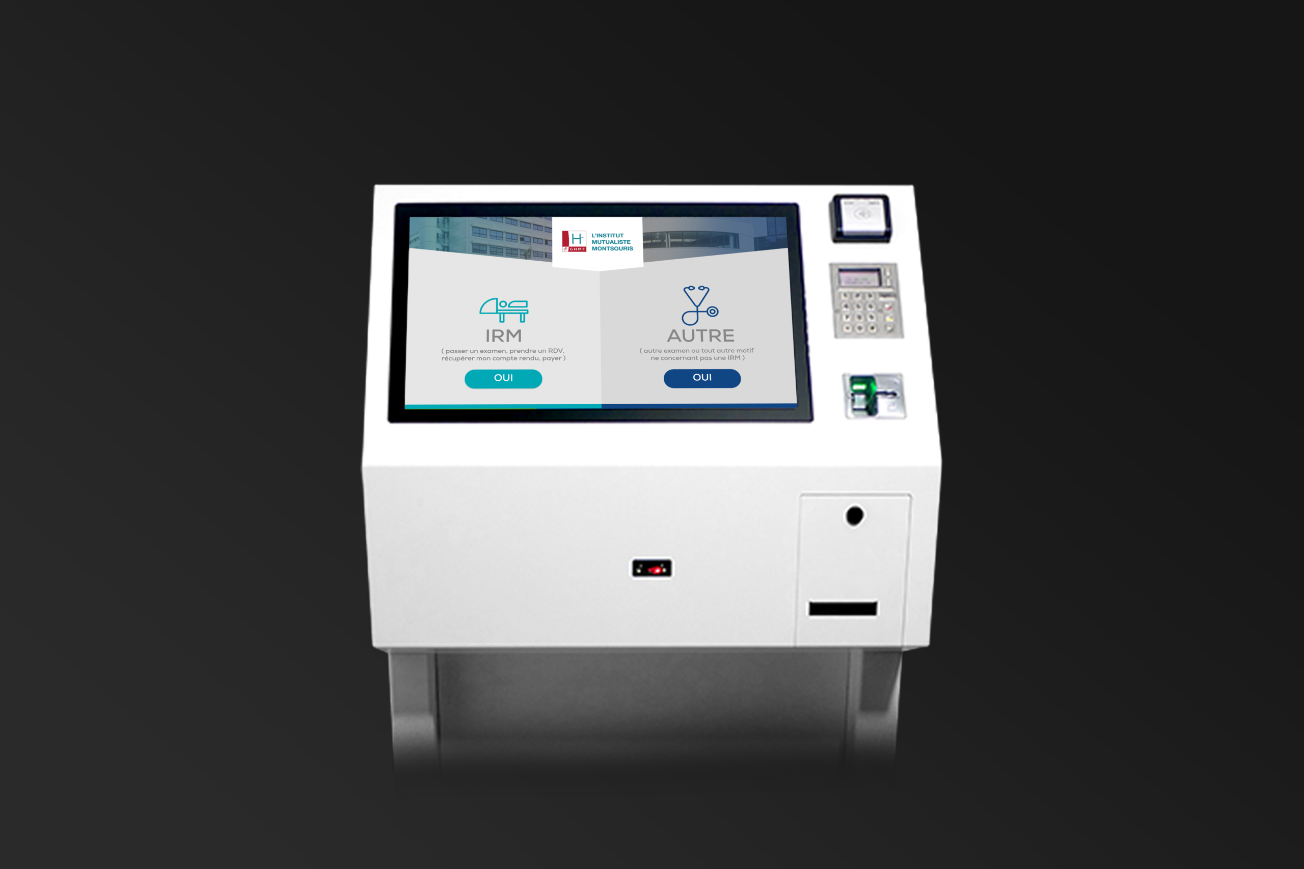 Côté patient, la logique est simple, immédiate et autonome : le visiteur se présente à la borne iMED (avec imprimante intégrée), sélectionne l’objet de sa venue (imagerie, cardio, etc.) et récupère un ticket avec un numéro spécifique. Ce ticket devient un repère clair : il réduit l’incertitude, canalise le patient vers la bonne file, et standardise l’entrée dans le parcours. Résultat : moins de regroupement au guichet, moins de questions répétitives, et une meilleure répartition des flux dès les premières minutes.