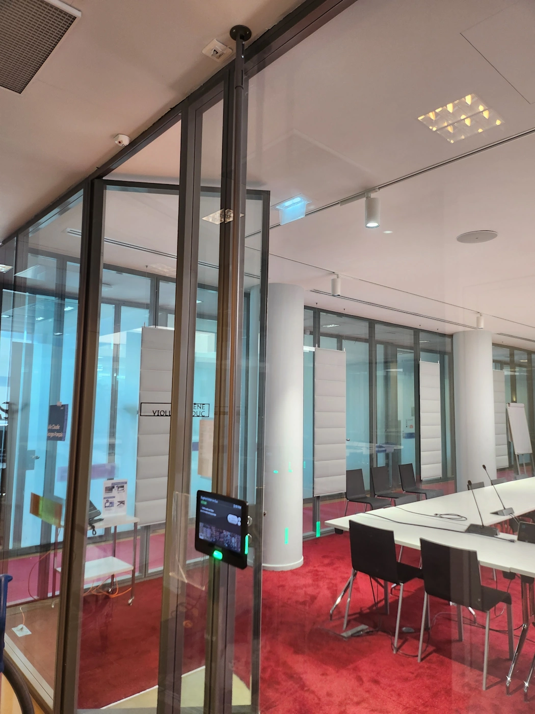 Suite à l’audit des 150 salles réparties sur trois bâtiments, nous avons conçu plusieurs méthodes d’intégration adaptées aux différentes typologies de cloisons : murs en placo, béton, cloisons bois côtelées et parois vitrées. Pour ces dernières, ELECOM a conçu et fabriqué un mât de fixation spécifique, permettant de suspendre la tablette tout en intégrant le passage du câble RJ45 d’alimentation.