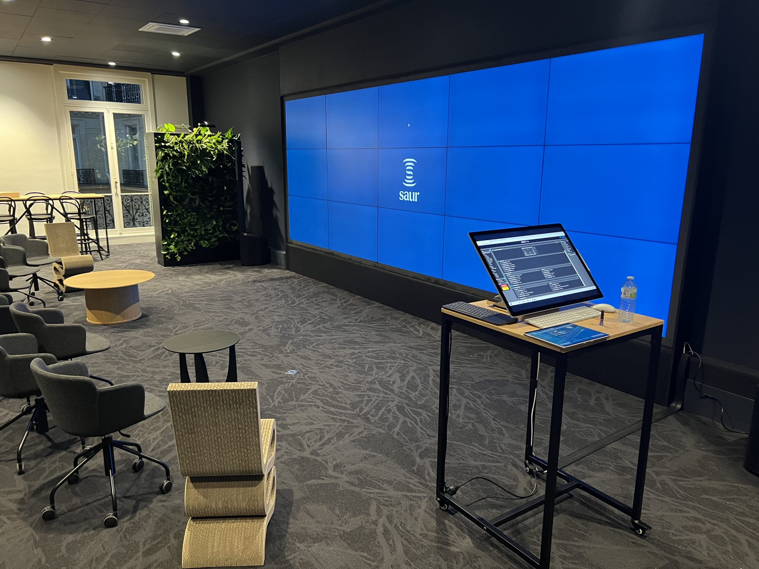 L’ensemble de l’expérience est orchestré par l’application SAUR, qui permet de piloter les contenus, les scénarios d’affichage, la répartition des informations sur le mur d’images ainsi que les équipements audiovisuels et lumineux, depuis une tablette ou une borne tactile unique. Cette approche offre aux équipes de SAUR une interface simple et intuitive, leur permettant de gérer facilement leurs présentations, démonstrations et ateliers collaboratifs avec leurs clients.