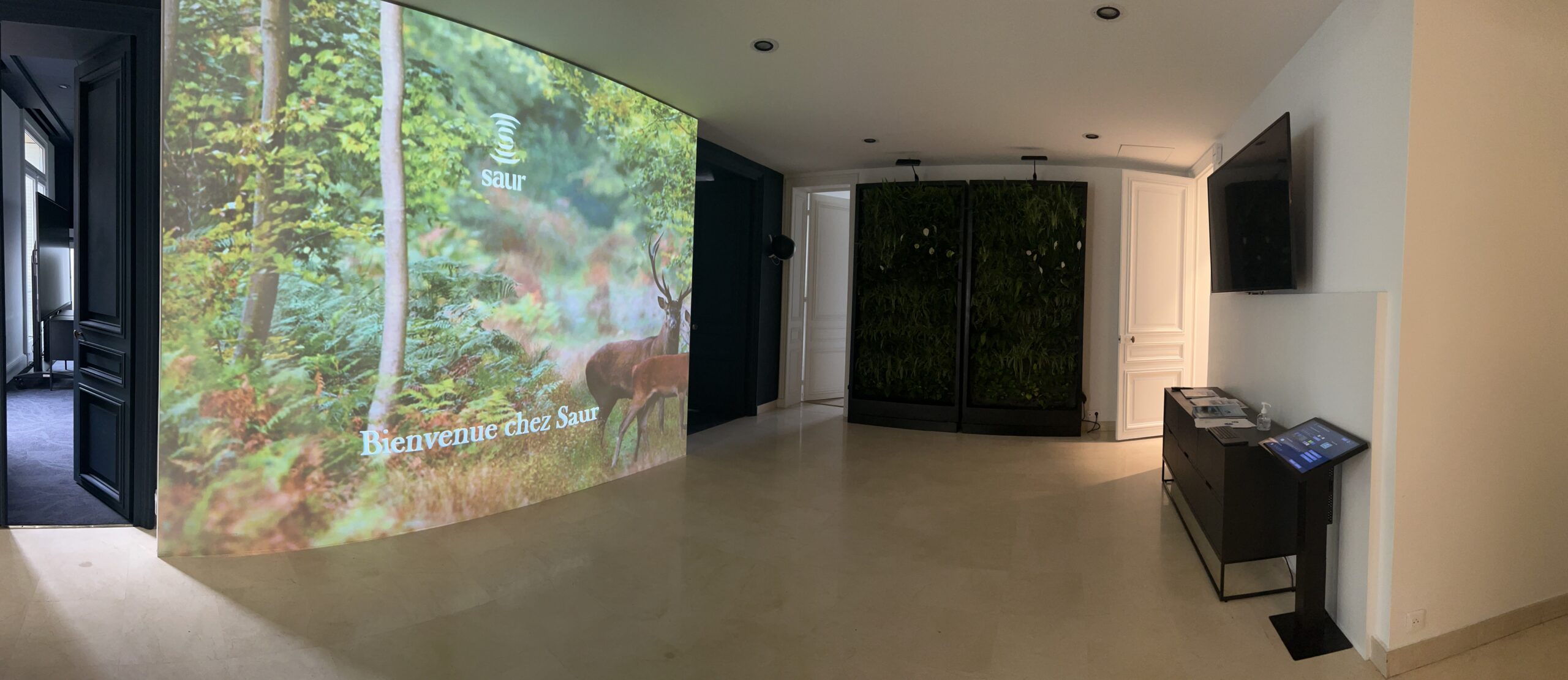 À l’entrée de l’espace, nous avons mis en place un mapping vidéo sur un mur en relief, créant une expérience visuelle forte dès l’arrivée des visiteurs. Cette mise en scène est pilotée par l’application SAUR réalisée sur-mesure, permettant de déclencher et d’adapter les contenus selon le contexte d’accueil. L’ambiance de l’entrée, composée d’enceintes professionnelles Devialet et d’un éclairage scénarisé, peut également être contrôlée depuis l’interface tactile, afin de créer différents scénarios d’accueil.